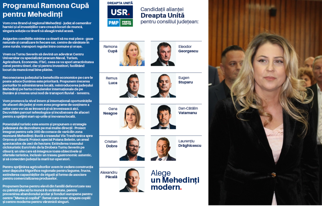 Lista candidaților pentru Consiliul Județean Mehedinți este deschisă de Ramona Cupă, actualul vicepreședinte al Consiliului Județean Mehedinți. În urmă cu patru ani, după alegerile locale din 2020, Ramona Cupă pășea pentru prima oară în politica mare, câștigând un mandat de consilier județean pe listele PMP. A fost aleasă mai apoi, de consilierii județeni, ca vicepreședinte al Consiliului Județean. Acum își dorește să continue munca de la Consiliul Județean, dar și proiectele de anvergură puse în practică în ultimul mandat, alături de colegii săi.
