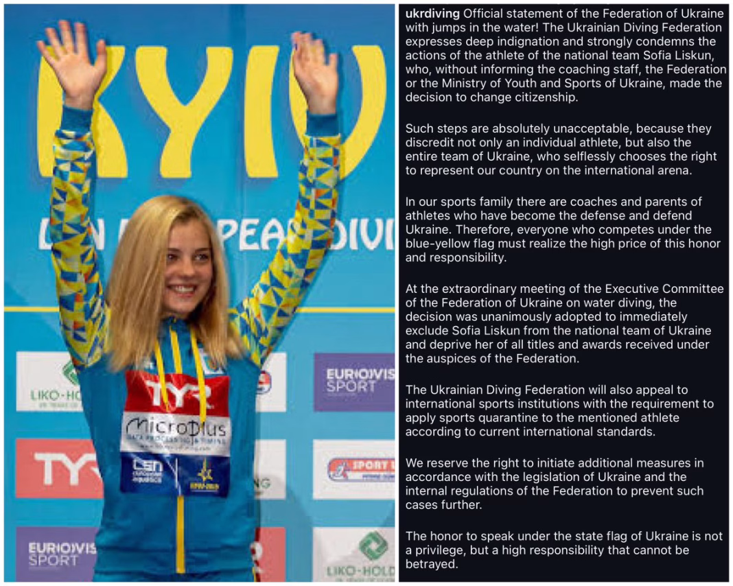 Campioana europeană a Ucrainei la sărituri în apă Sofia Liskun a cerut cetățenia rusă. Sportiva a declarat pentru mass-media ruse că în Ucraina nu este susținută în sport și că nu poate evolua.