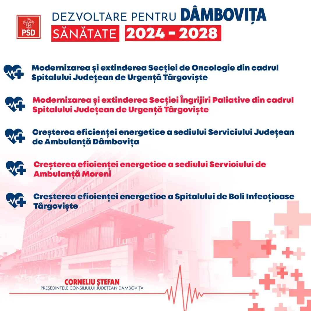 Promisiune onorată! Sănătatea dâmbovițenilor a fost pe primul loc în mandatul meu de președinte al Consiliului Județean #Dâmbovița! Proiectul „Sănătate pentru Dâmboviţa” s-a materializat în investiții concrete de peste 95.000.000 de lei la Spitalul Județean de Urgență din Târgoviște, dovada grijii și a respectului pe care le avem pentru sănătatea dâmbovițenilor. Și acesta a fost doar începutul! În perioada 2024-2028 vom consolida sistemul de sănătate dâmbovițean!, a anunțat pe Facebook președintele CJ Dâmbovița, Corneliu Ștefan, candidat PSD pentru un nou mandat.