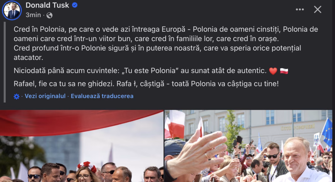 Donald Tusk a postat pe fb despre mitingul de la azi de la Varșovia, prezentat de o parte a presei de la București ca o „mare victorie politică” a lui Neicusor. Problema e că ND nu există in postarea lui DT. Nici măcar in poze….