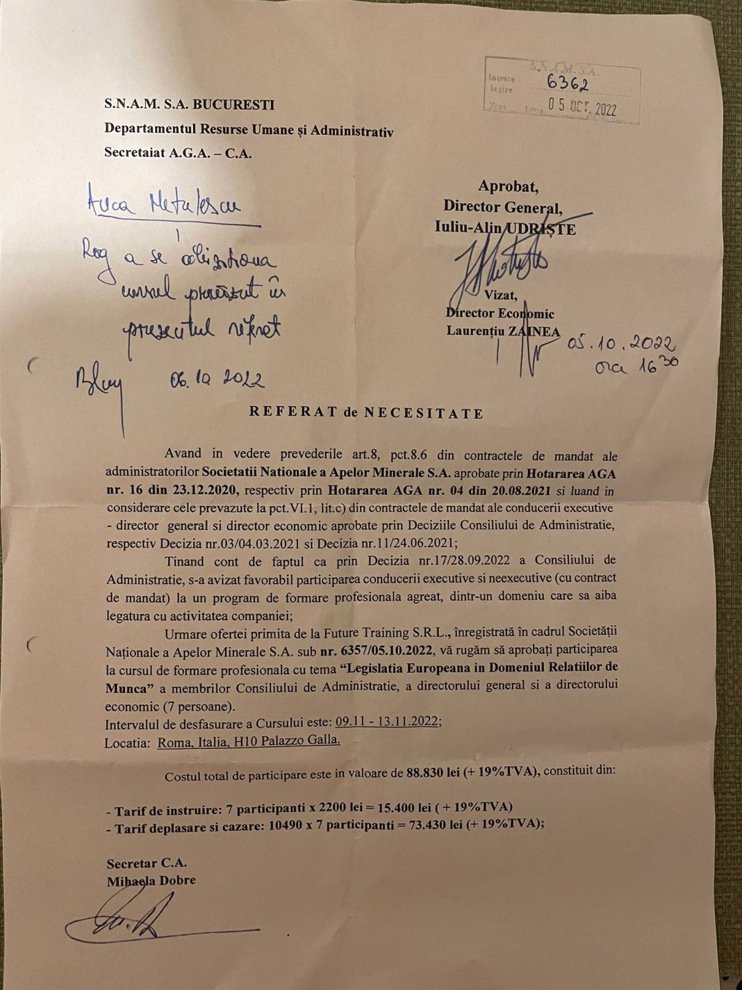 Membri ai Consiliului de Administrație al Societății Naționala a Apelor Minerale (SNAM) și-au aranjat o excursie la Roma pentru a studia cursul Legislația Europeană în domeniul Relațiilor de Muncă. Majoritatea sunt oamenii lui Virgil Popescu, ministrul Energiei, liderul PNL Mehedinți. Dar s-a dedulcit și un userist.
