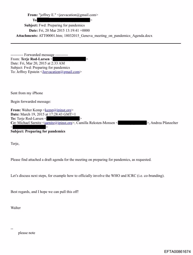 Mare atenție cu documentele atribuite dosarului Epstein. Unele sunt pur și simplu inventate, nu se regăsesc în arhiva făcută publică. Altele sunt acolo dar nu fac două parale, sunt fanteziile a tot felul de nebuni pe care procurorii erau obligați să le adauge la dosar. Dar sunt și destule grozăvii credibile, pentru că țin de corespondența trimisă sau primită de Epstein însuși. Asta de față, de exemplu, se confirmă. Ca să fie clar: nu-i de neînchipuit ca astfel de discuții să existe, dubios este cum și de ce ajunge să fie informat vreodată despre ele unul ca Epstein! „Terje, te rog să găsești atașată propunerea de agendă pentru întâlnirea despre pregătirea pentru pandemie, așa cum ai cerut. Hai să discutăm următorii pași, de exemplu cum să implicăm oficial OMS și Crucea Roșie (de exemplu co-branding). Toate cele bune, și sper să ne iasă combinația!Walter”, a scris jurnalistul Lucian Davidescu pe Facebook.