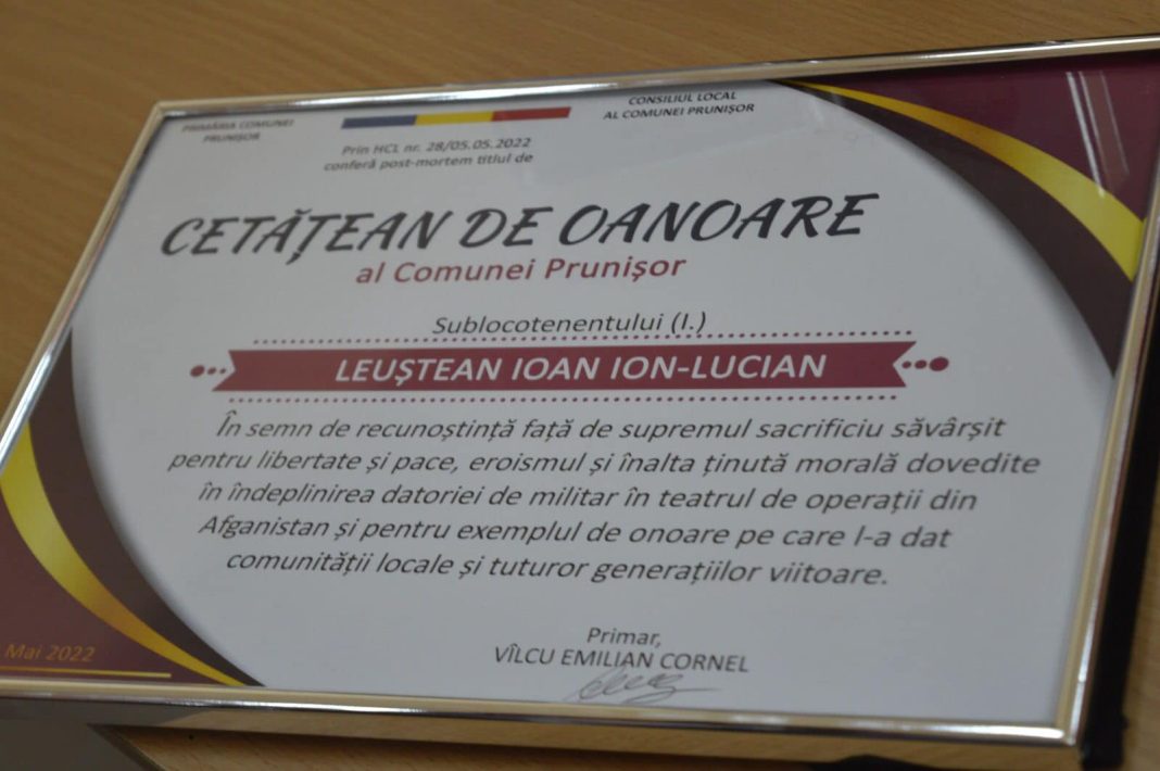 Sublocotenentul Ion Lucian Leuștean, decedat în anul 2012, la vârsta de 26 de ani, după ce a fost rănit într-o misiune în teatrul de operații din Afganistan, a fost declarat cetățean de onoare post mortem al comunei Prunișor, localitatea natală a tânărului.