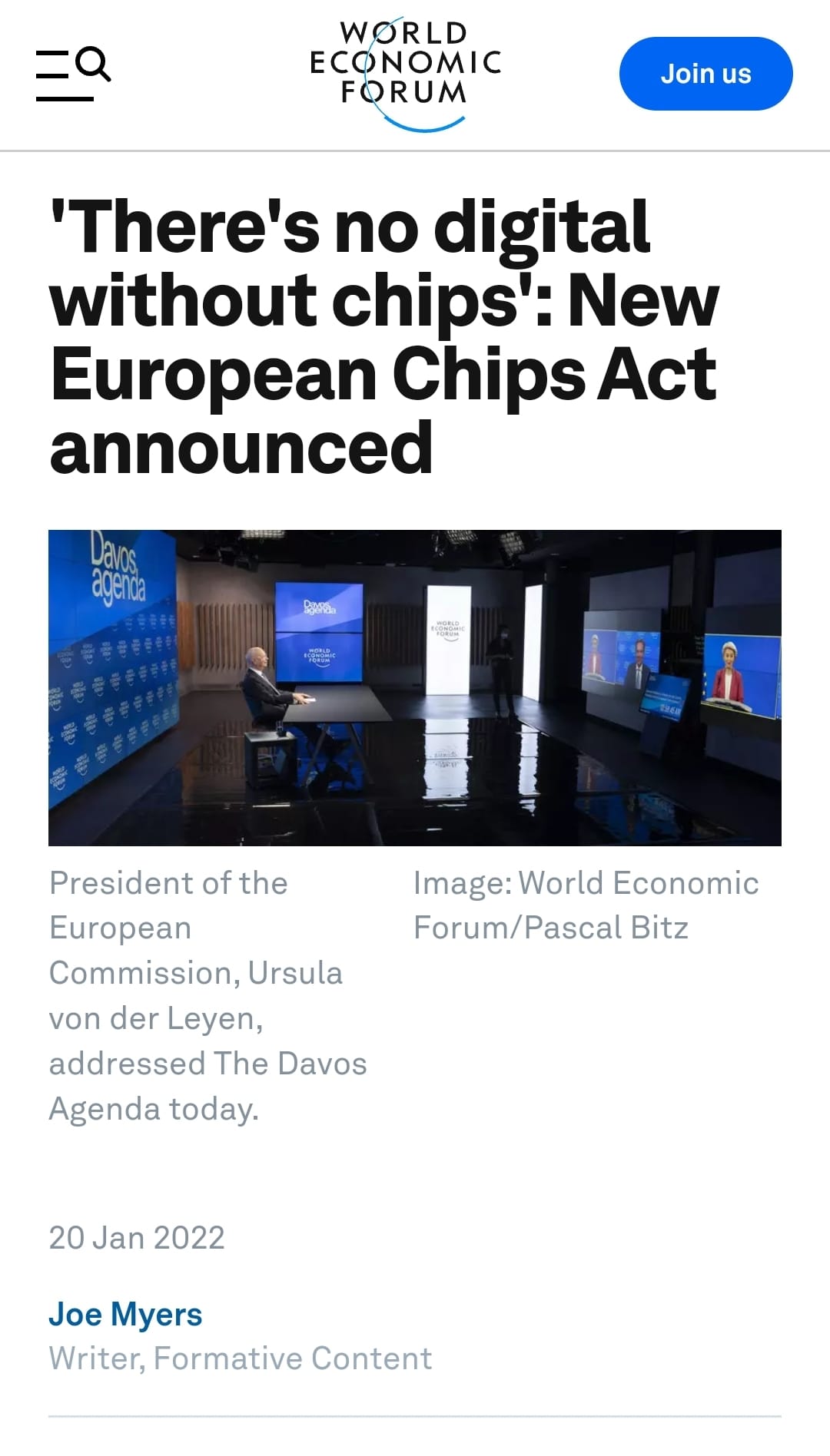 Ursula von der Leyen a anuntat pe 20 ianuarie 2022, in cadrul Forumului Economic Mondial de la Davos, ca in februarie Comisia Europeana va propune „European Chips Act”, un act ce priveste dezvoltarea cipurilor in UE, ce se coreleaza direct cu digitalizarea, afirmă europarlamentarul PNȚCD Cristian Terheș pe Facebook.