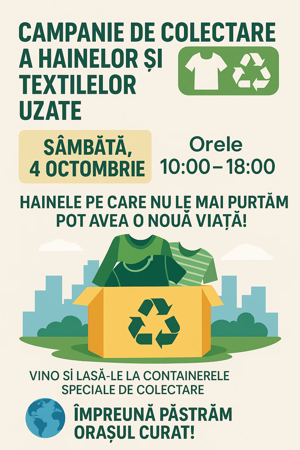 Primăria Drobeta-Turnu Severin organizează sâmbătă, 4 octombrie 2025, între orele 10:00 – 18:00, o campanie de colectare a hainelor și textilelor uzate.