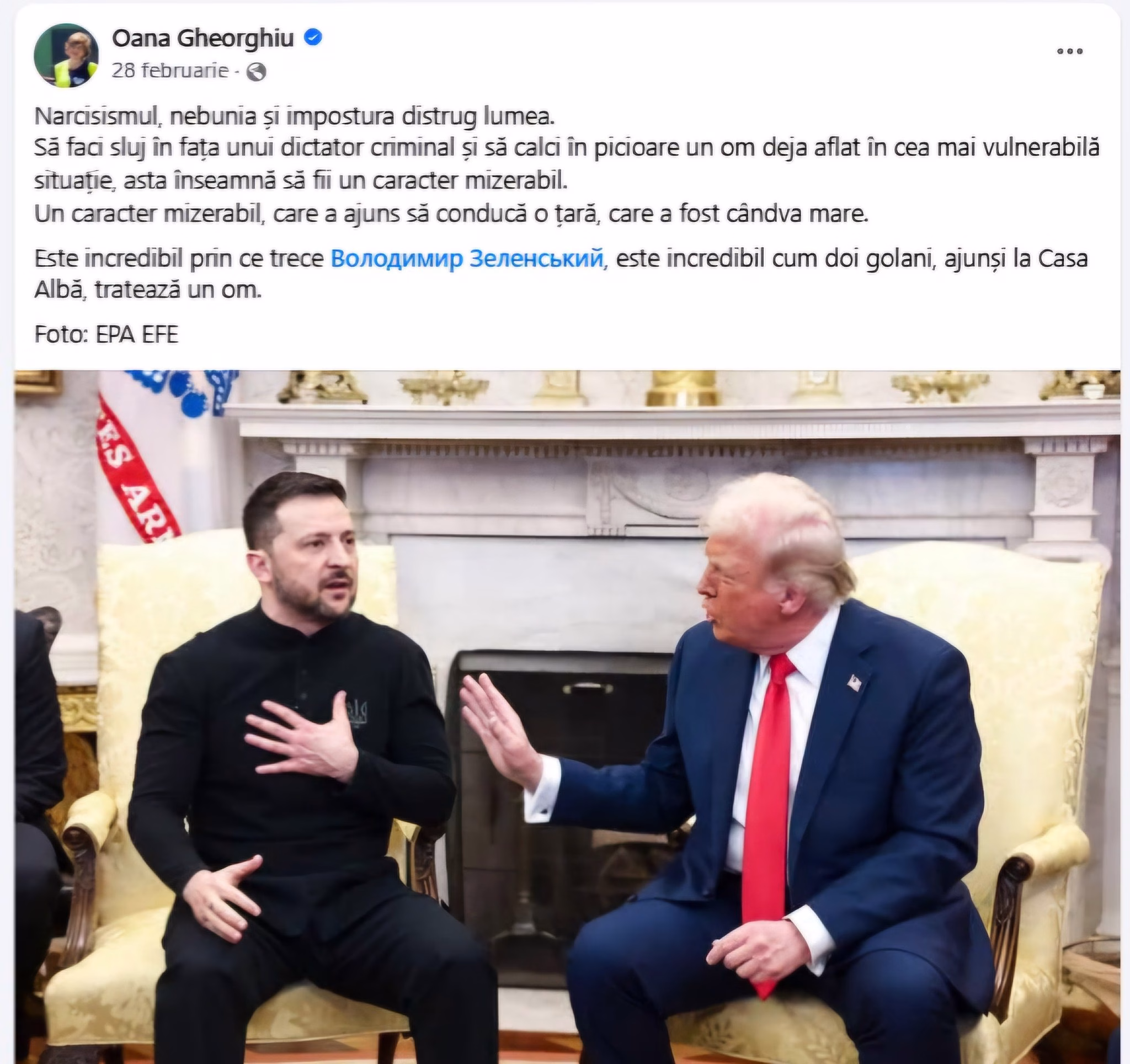 Oana Gheorghiu propus vicepremier de premierul Ilie Bolojan a susținut într-o postare pe Facebook de pe 28 februarie că președintele Donald Trump si vicepremierul Vance sunt „doi golani”.