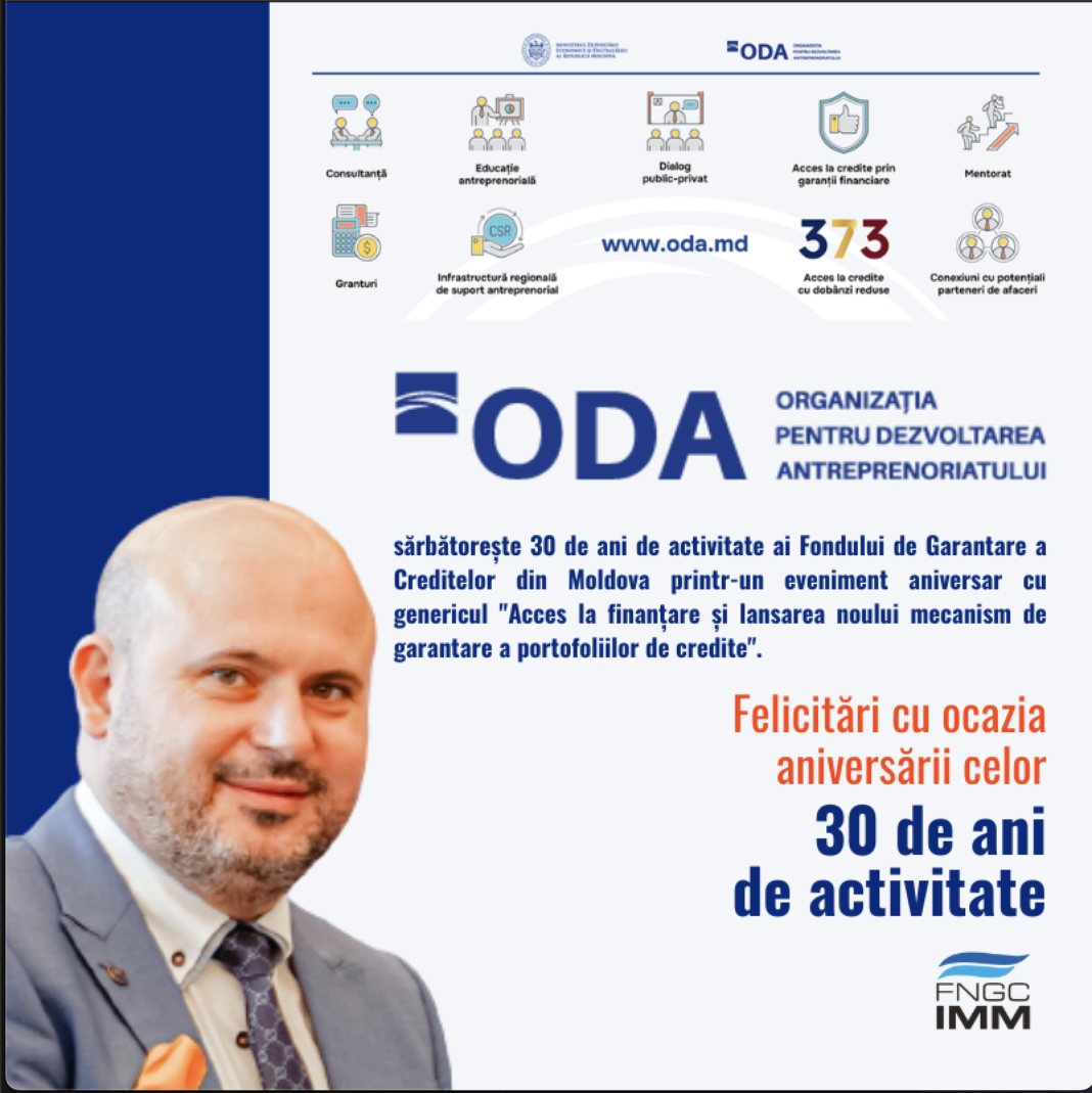 În data de 27 Octombrie 2023, domnul Dumitru Nancu – directorul general al FNGCIMM și vicepreședinte al AECM va fi prezent la Chișinău pentru a marca, împreună cu Organizația pentru Dezvoltarea Antreprenoriatului – ODA- 30 de ani de activitate a Fondului de Garantare a Creditelor din Republica Moldova.