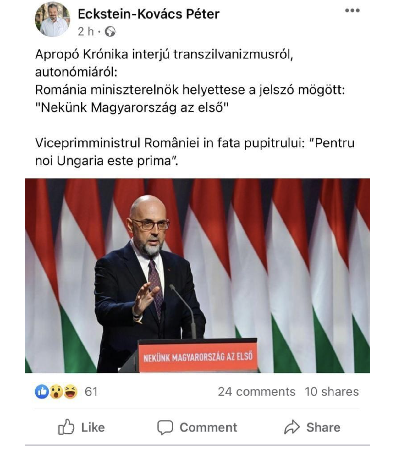 Liderul UDMR Cluj, Csoma Botond, îl acuză pe fostul senator Péter Eckstein-Kovács că vrea să creeze tensiuni între români și maghiari. Totul a pornit de la o fotografie în care apare Kelemen Hunor, la congresul Fidesz, vorbind la un pupitru pe care scria: Pentru noi Ungaria este prima, scrie Ziua de Cluj.