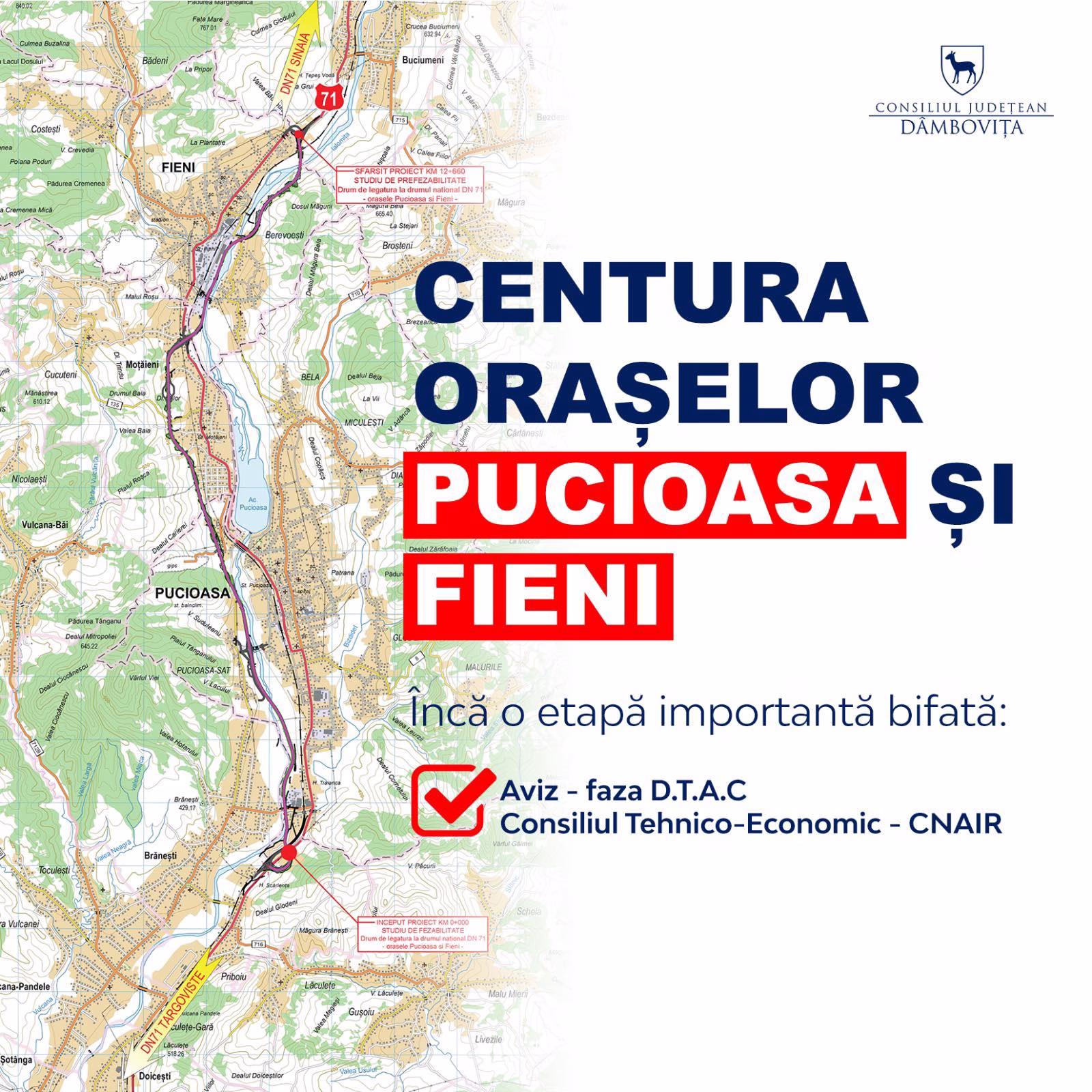 Centura Orașelor Pucioasa și Fieni intră în linie dreaptă! Proiectul privind Centura Orașelor Pucioasa și Fieni a mai trecut o etapă esențială: a fost obținut, pentru faza D.T.A.C., Avizul Consiliului Tehnico-Economic al Companiei Naționale de Administrare a Infrastructurii Rutiere. Următorii pași vizează finalizarea proiectului tehnic, obținerea Autorizației de Construire și începerea lucrărilor, a anunțat președintele CJ Dâmbovița Corneliu Ștefan (PSD)