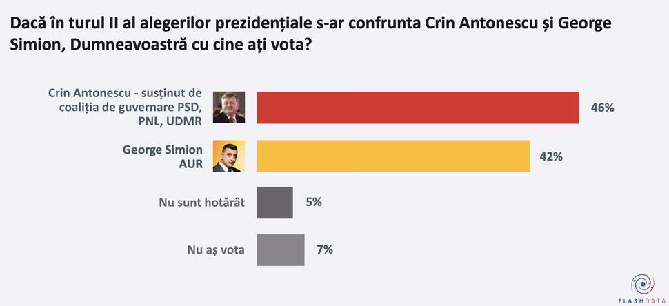 De asemenea, conform sondajului, Crin Antonescu ar câștiga în turul doi împotriva oricărui contracandidat, în timp ce George Simion l-ar învinge pe Nicușor Dan.