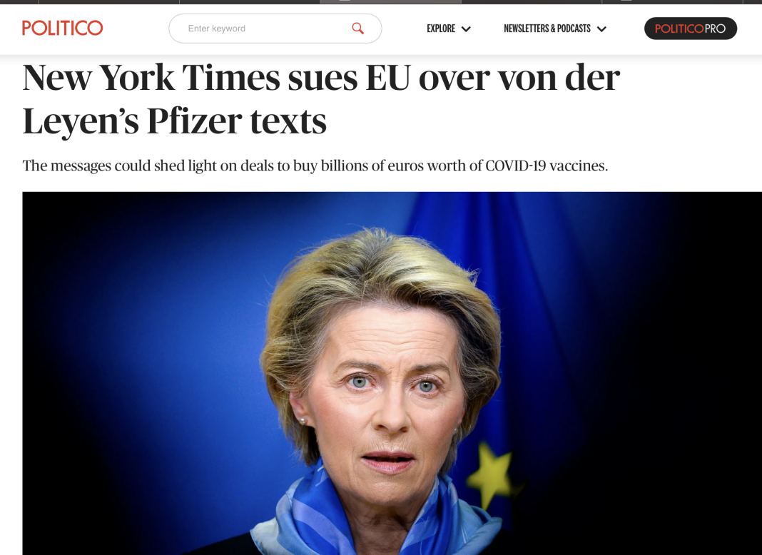 Ursula von der Leyen a fost dată în judecată de NY Times la CJUE pentru a obține SMS-urile prin care a „negociat” direct cu Albert Bourla, CEO-ul Pfizer, achiziționarea a miliarde de doze de vaccinuri, anunță Politico pe data de 13.02.2023.”Publicația se va confrunta cu avocații UE în cea mai înaltă instanță europeană, argumentul acesteia fiind că Comisia are obligația legală de a publica mesajele, care ar putea conține informații despre acordurile UE privind cumpărarea de doze de COVID-19 în valoare de miliarde de euro”, arată Politico.https://www.politico.eu/…/new-york-times-sue-european…/Dosarul în cauză, ce are numărul T-36/23 „Stevi and The New York Times v Commission”, a fost înregistrat pe data de 25 ianuarie 2023 și făcut public public azi, 13 februarie 2023, anunță pe Facebook europarlamentarul Cristian Terheș.