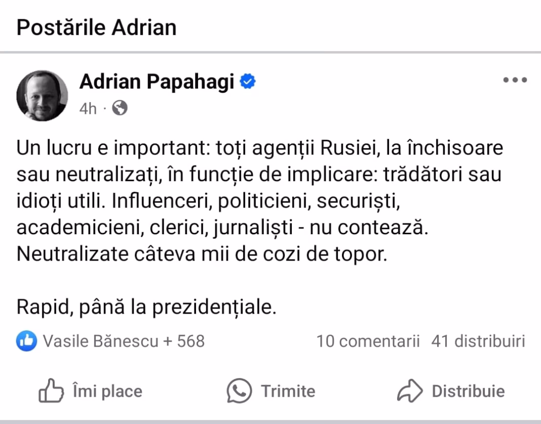Adevărata democrație este asta, cea explicată de Papahagi: cine nu are aceeași opinie cu noi, să meargă la pușcărie! Cum de ce? E „putinist”, e „legionar”, zice ceva anti-noi și regimul nostru.Îmi amintesc cu nostalgie de regimul unde chiar se întâmpla asta: aaa, nu lui, că nu avea cum… ar fi fost pe discursul perfect corespunzător și atunci, a scris pe Facebook avocata Ingrid Mocanu.